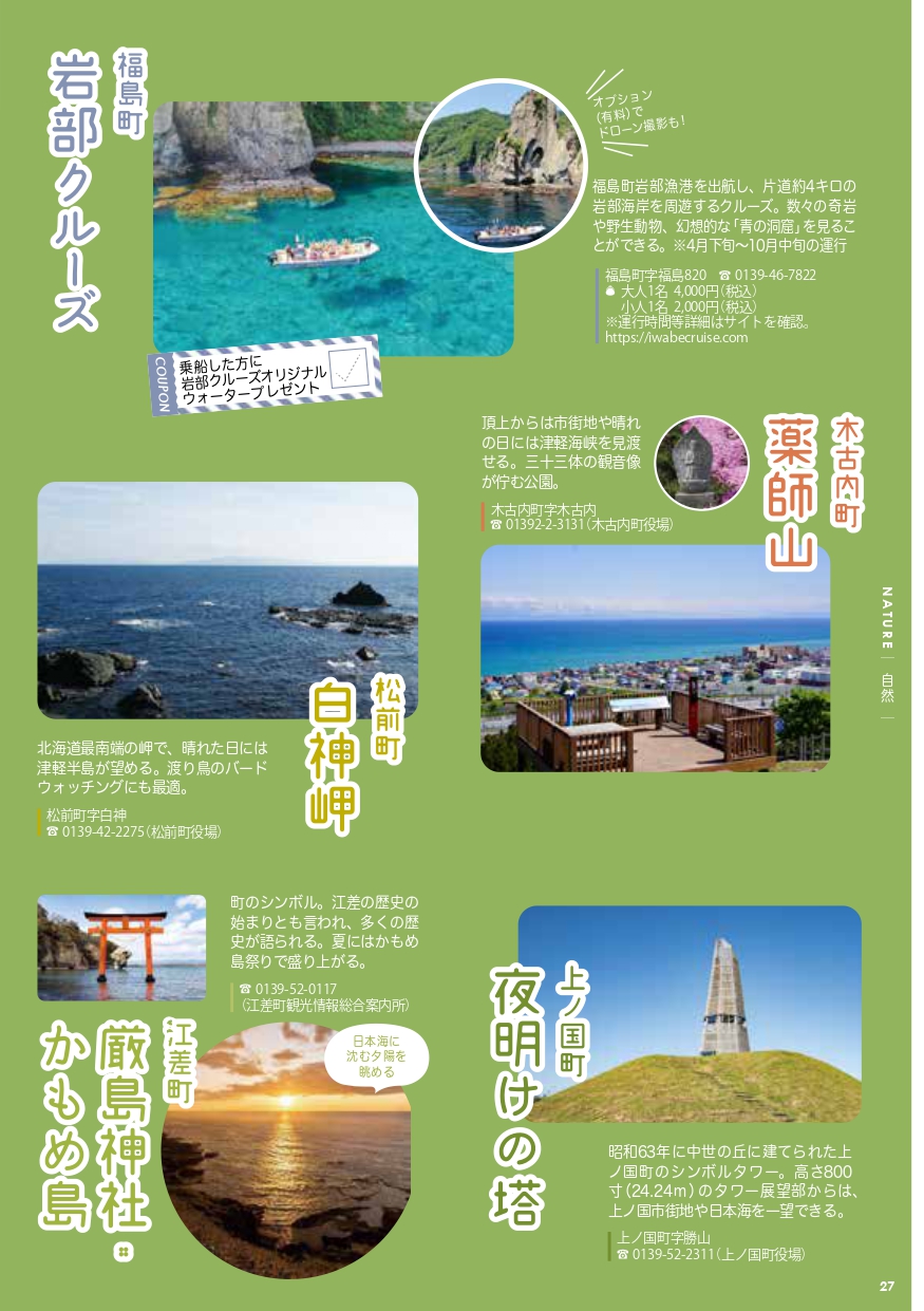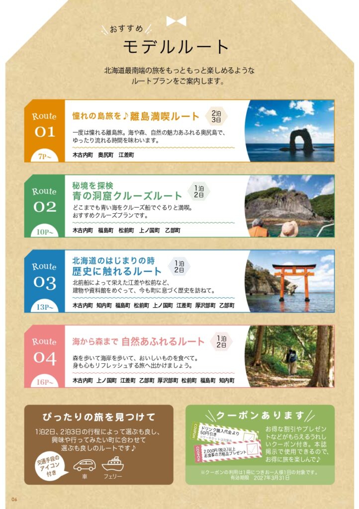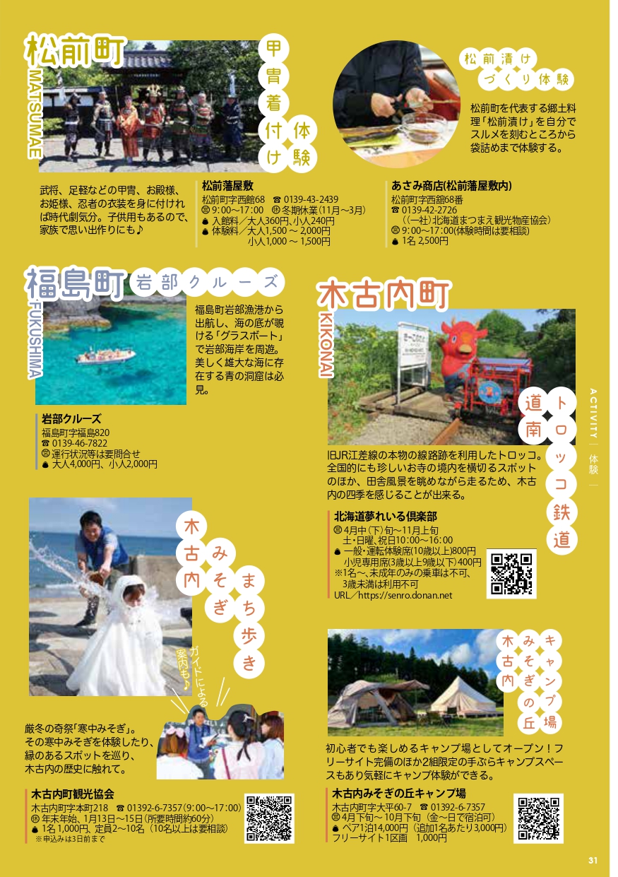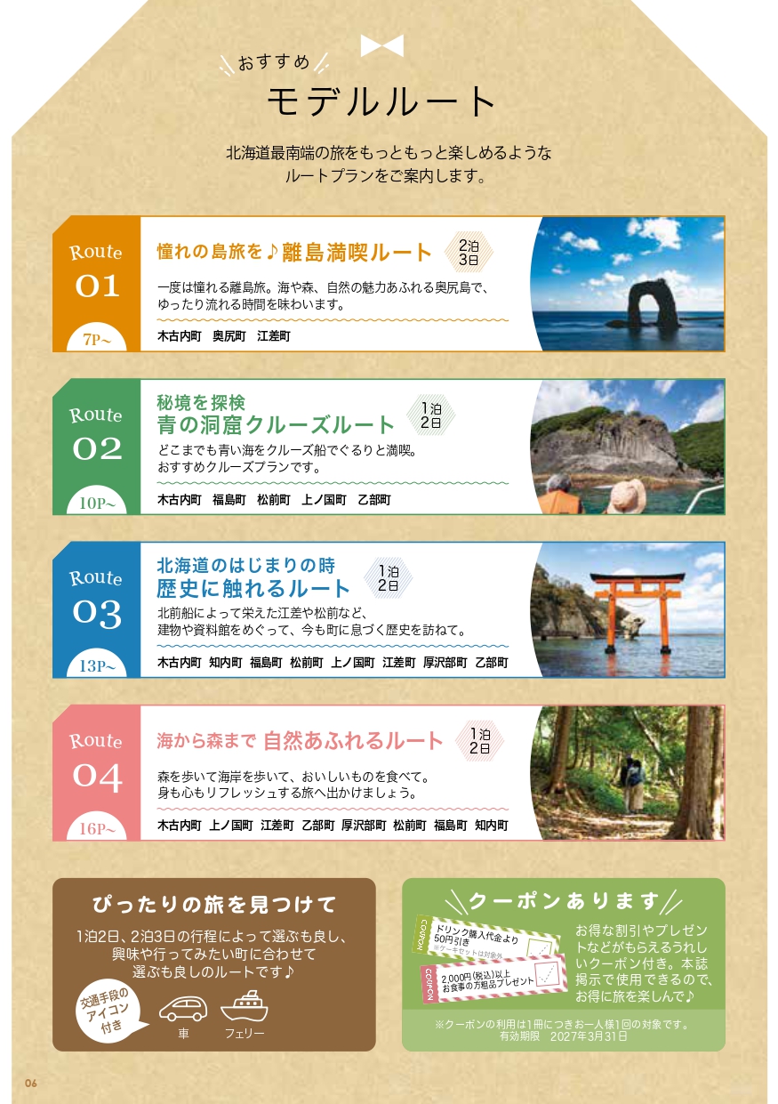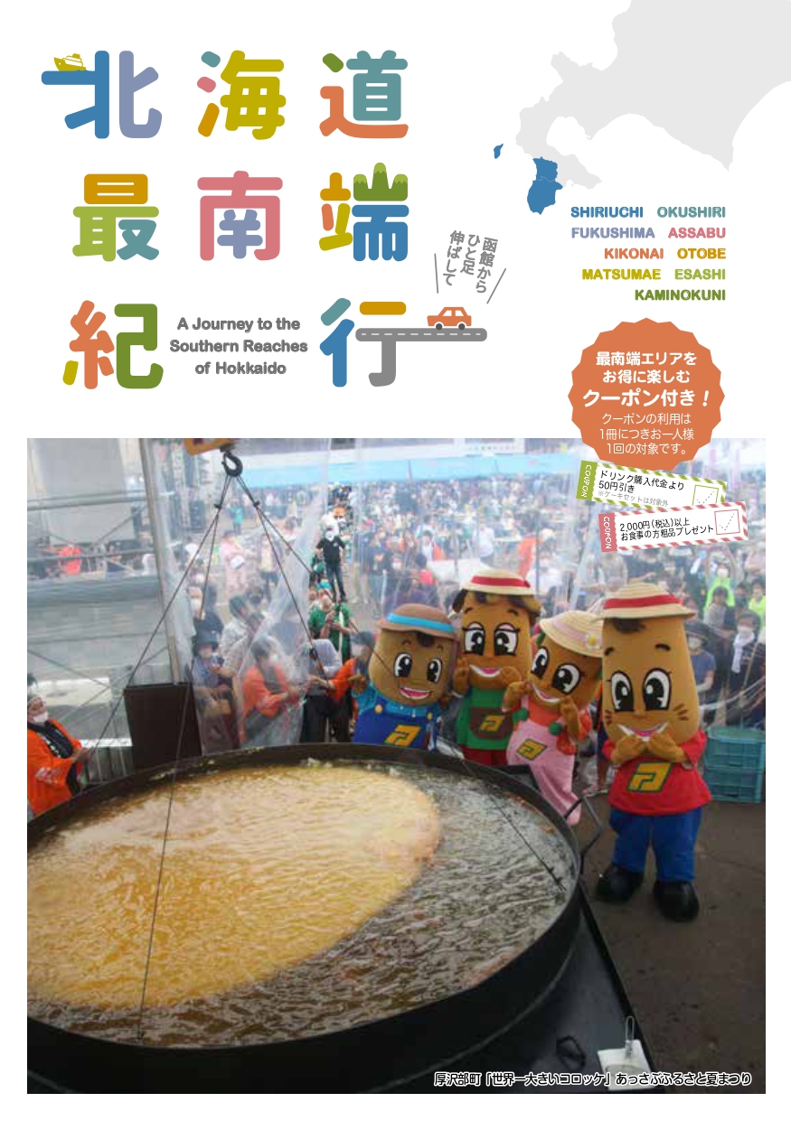北海道南西部9町(木古内町、知内町、福島町、松前町、江差町、上ノ国町、厚沢部町、乙部町、奥尻町)の「見る」「食べる」「遊ぶ」を徹底的にガイドした旅行情報誌「北海道最南端紀行」(2026版)ができました! モデルルートや飲食店情報、体験なども紹介しており、これ一冊で道南旅プランを決めることができます! さらに、お得なクーポンも付きます! ぜひご覧になってみて、北海道最南端をめぐる旅へ!