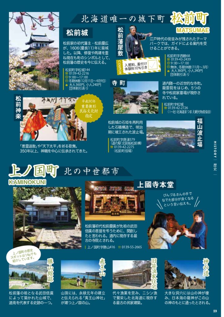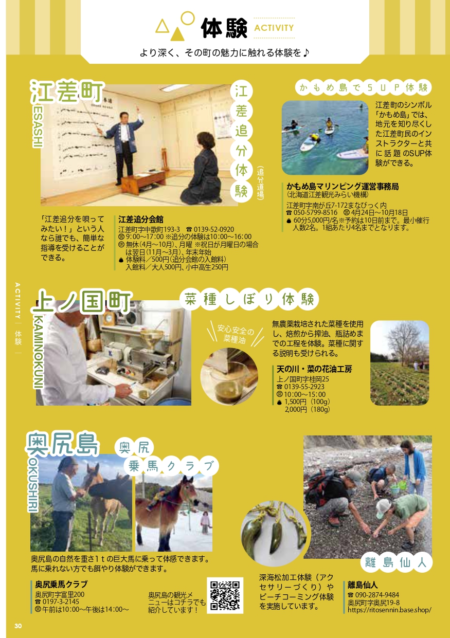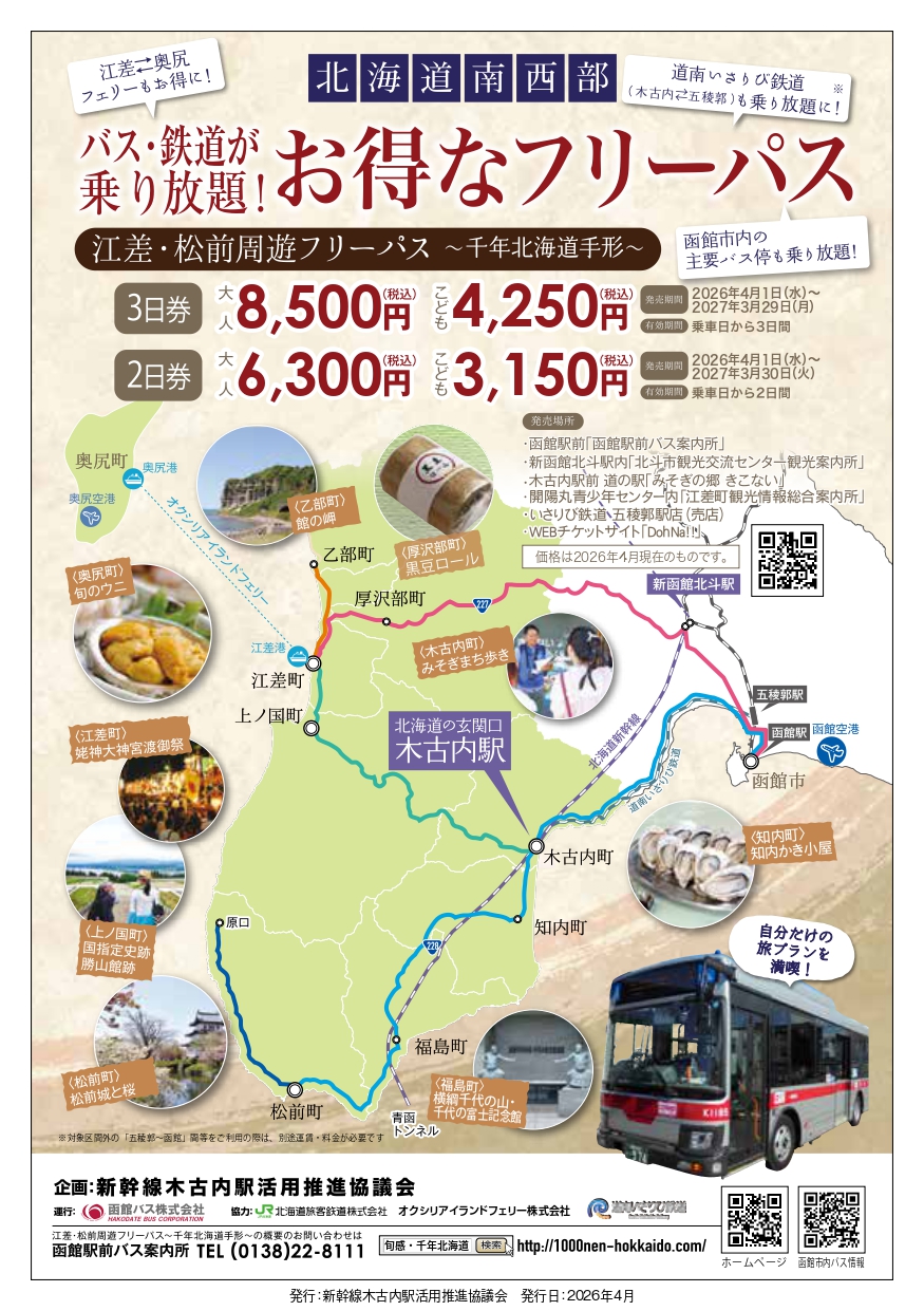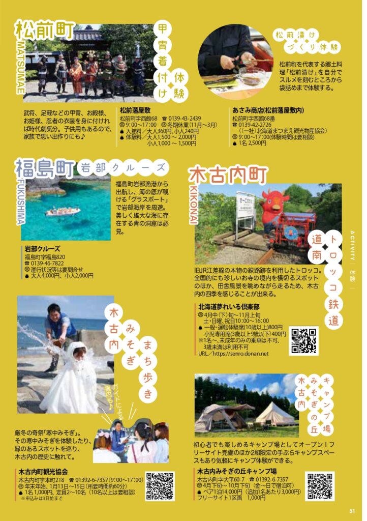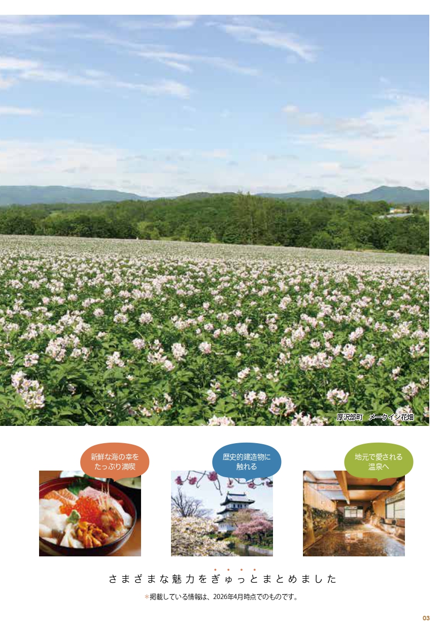 北海道南西部9町(木古内町、知内町、福島町、松前町、江差町、上ノ国町、厚沢部町、乙部町、奥尻町)の「見る」「食べる」「遊ぶ」を徹底的にガイドした旅行情報誌「北海道最南端紀行」(2026版)ができました! モデルルートや飲食店情報、体験なども紹介しており、これ一冊で道南旅プランを決めることができます! さらに、お得なクーポンも付きます! ぜひご覧になってみて、北海道最南端をめぐる旅へ!